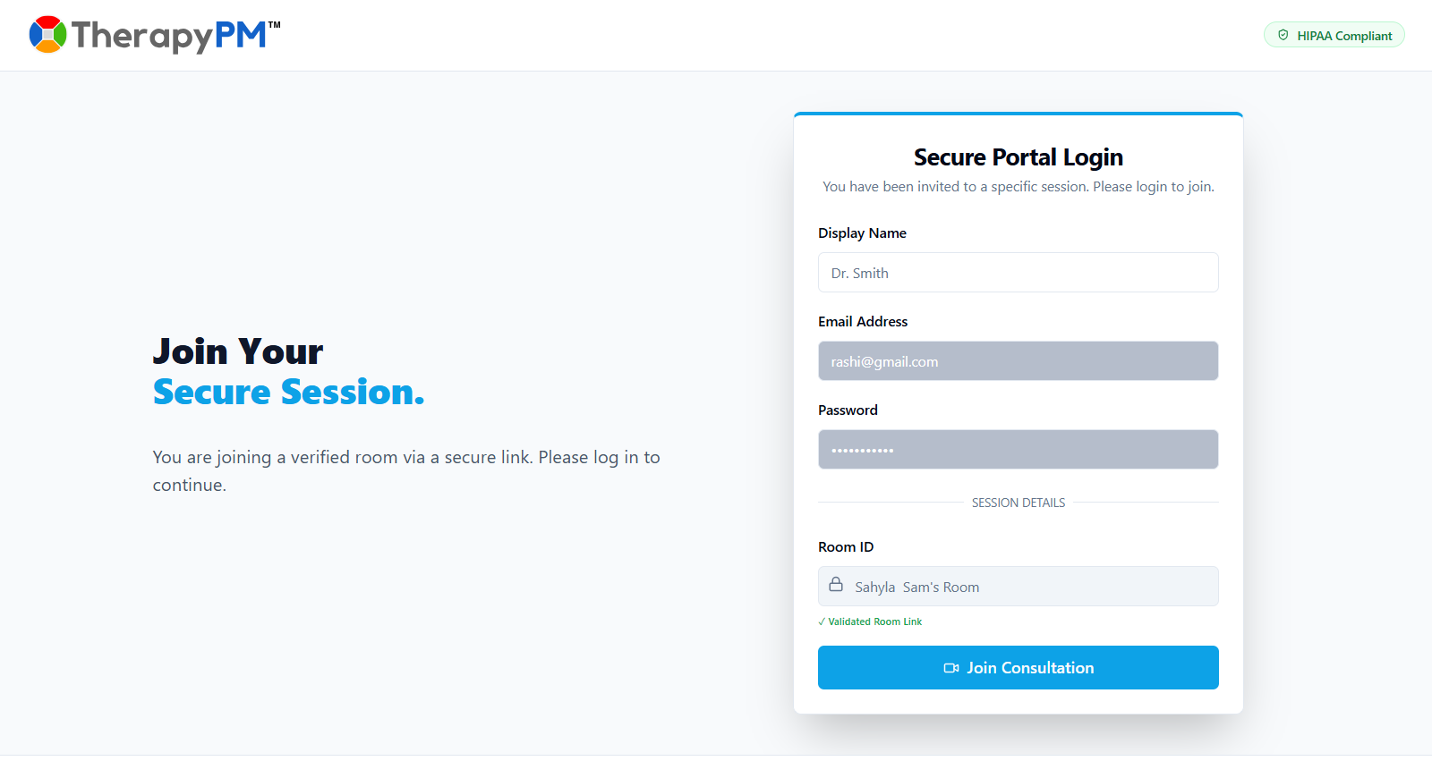 Step 2: Once you have sent the link to your clients, you start the sessions by clicking on that "Start Your Session" button. A new tab will open where you need to fill in your name and join the meeting.