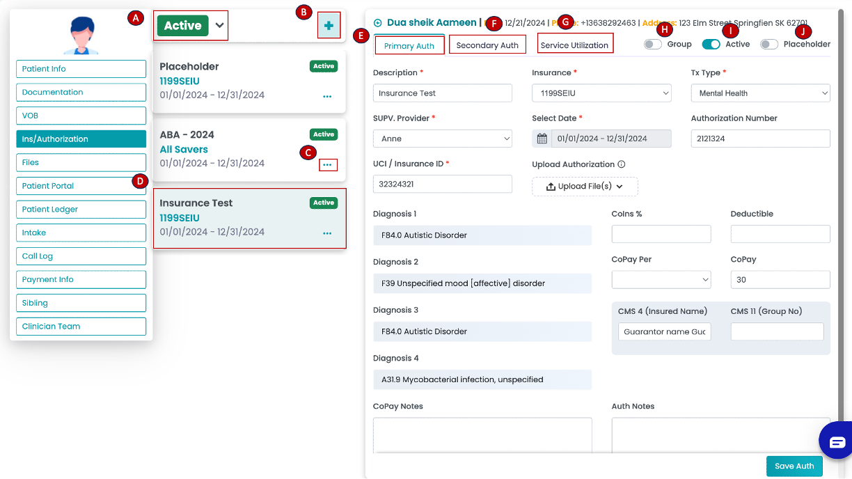For further information, you can click on the authorization block to view, as explained below:- Primary Auth Tab: View and update your patients' primary authorization information.