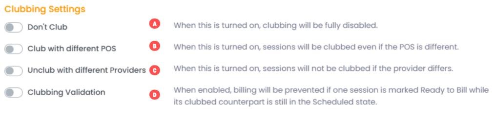 - Clubbing validation - When enabled, clubbing validation checks for related sessions that should be billed together. If you attempt to process a claim while a related session is still in a “Scheduled” status (i.e., not yet rendered), the system will show an alert.