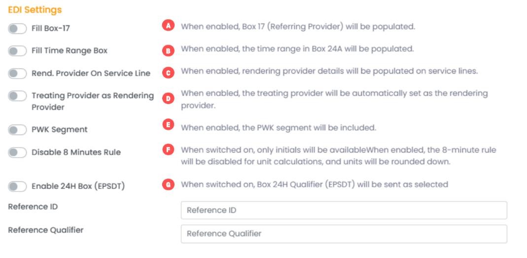 - 24H Box (EPSDT) - When switched on, Box 24H Qualifier (EPSDT) will be sent as selected. It can be set using the Reference ID and Reference Qualifier fields.