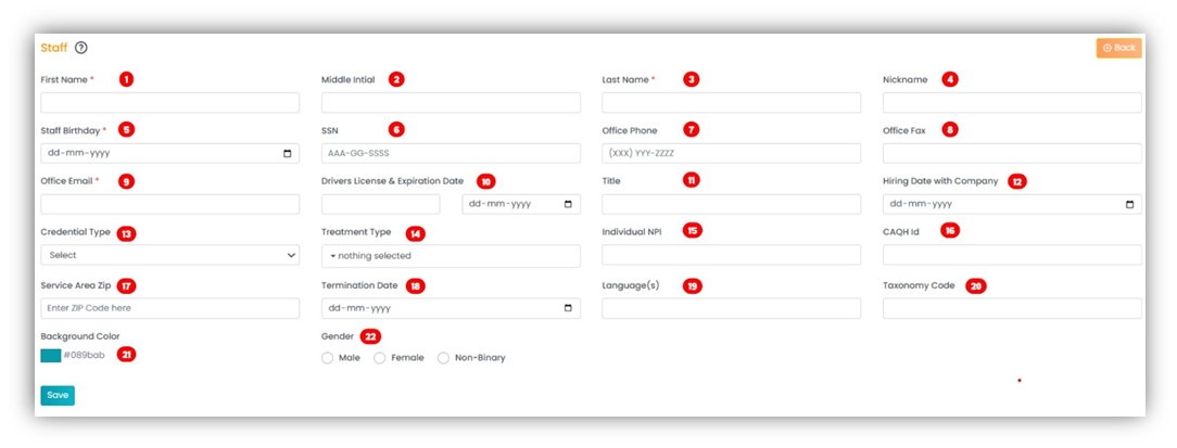 - First Name – Enter the first name of the staff/ provider. This is a required field.