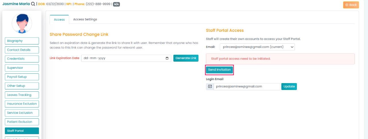 4. Share the portal link with your staff via email by clicking on the "Send Invitation" button. The email addresses that you provided during staff creation will automatically appear. You can see the status of their account setup on the screen