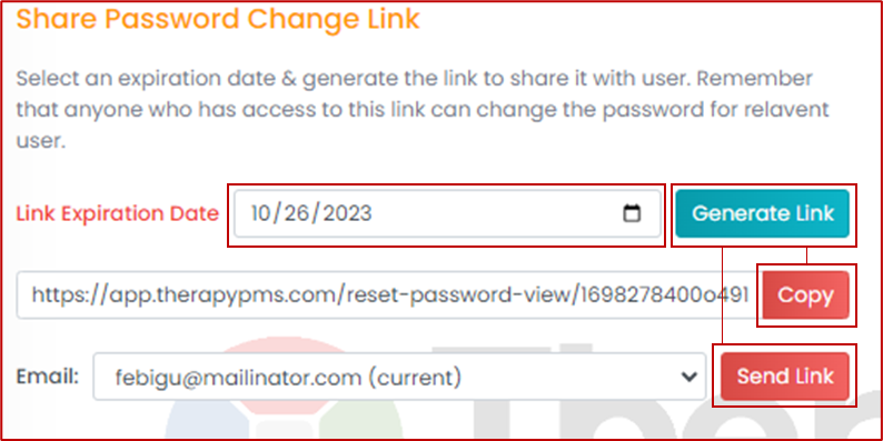 5. Alternatively, you can provide them with a link to change their password. Access the staff profile in the admin account and locate the "Staff Portal" tab. Choose an expiration date for the link and click on "Generate Link." You can then share it with them by