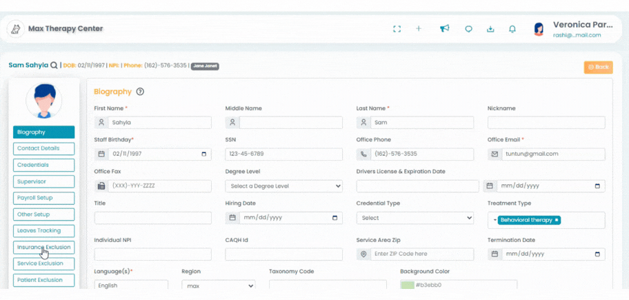 Navigate to the Staff module (left). Select your preferred staff(s) under the Staff list. Go to Insurance Exclusion on the left.