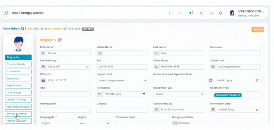 Navigate to the Staff module on the left. Under Staff list, click on your preferred staff(s). Go to Service Exclusion on the left.