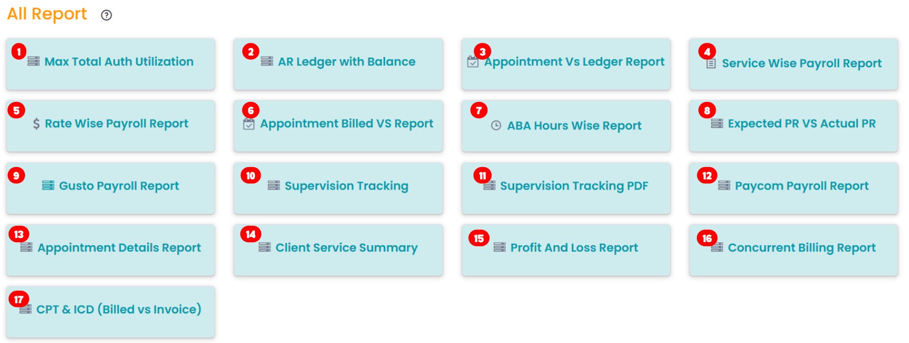 - ABA Hours Wise Report: This report provides a detailed breakdown of ABA therapy hours. It helps monitor and manage service hours efficiently.