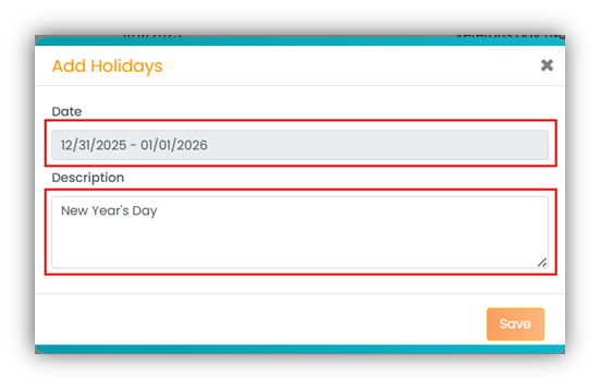- Click on the orange Add Holidays button on the bottom left. The Add Holiday pop up appears, Select the date(s) and add the description. The click on the "Save" button. Once the customized holiday is created, it will be added to the holiday list.