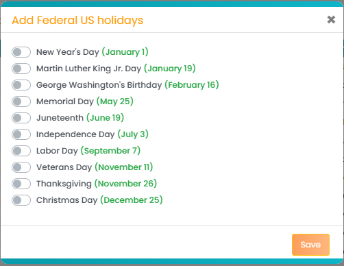 - From there, you can further manage holidays by clicking the Add Federal Holidays button located at the bottom-right corner. In the Add Federal US Holidays pop-up: You can toggle ON or OFF the federal holidays you would like to include.