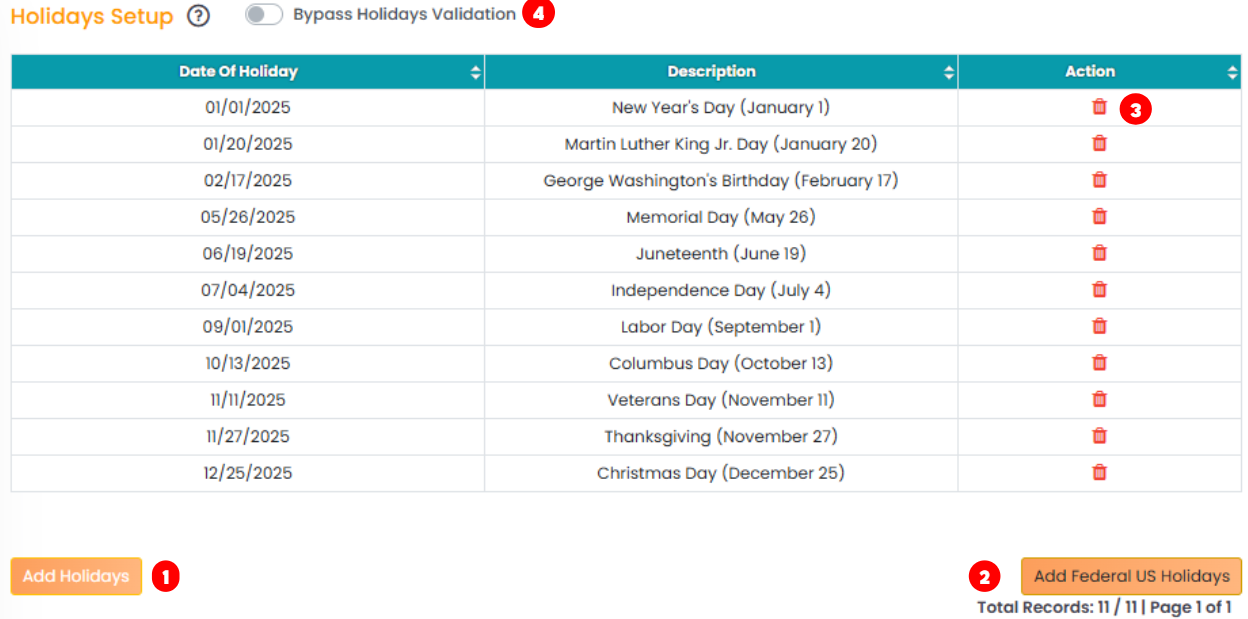 - Use the Action button next to any holiday in the list to delete or remove holidays as needed.