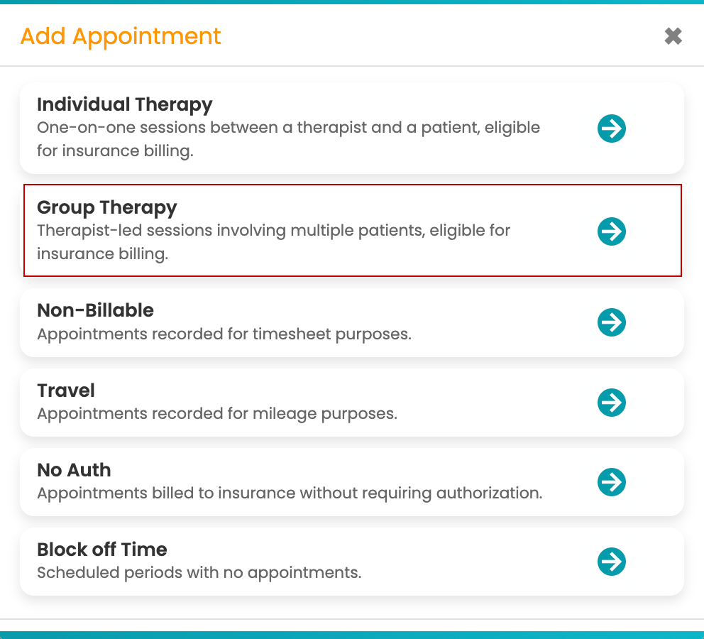- Add Appointments screen will appear with multiple options. Select the Group Therapy option.