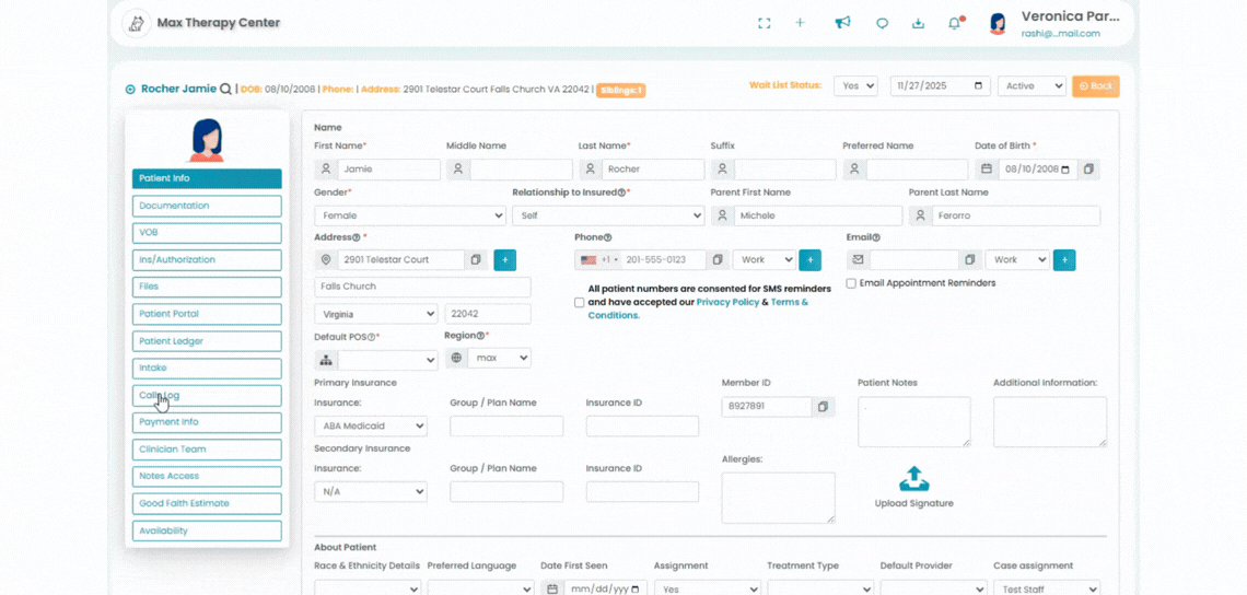 - After the patient is selected, access the "Call Log" option on the left.