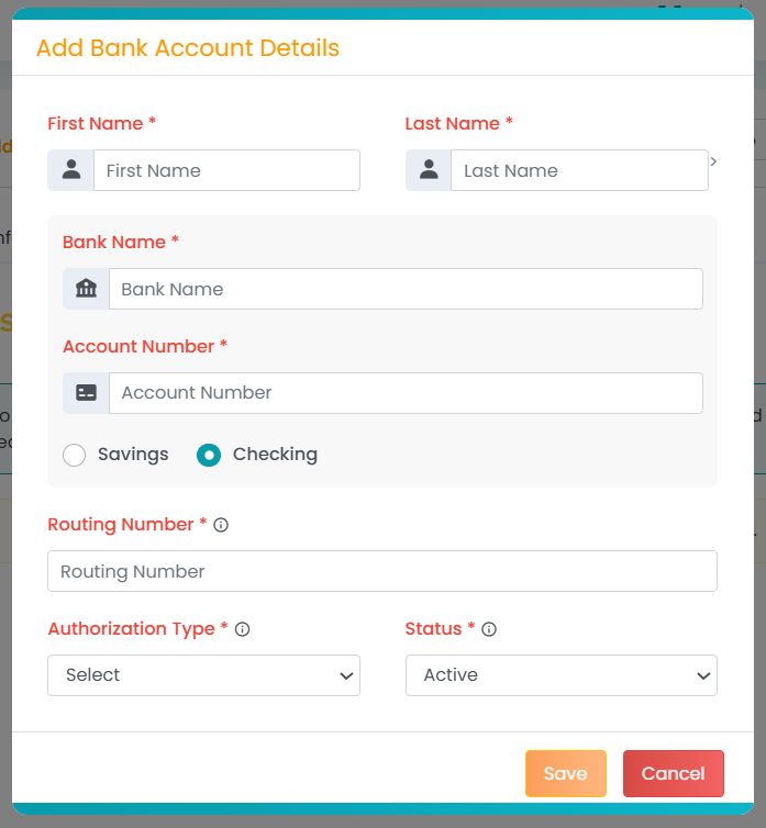 From the ACH List tab: The user will should add all the required details and Save. Bank details can be added from both the Admin Portal and the Client Portal.