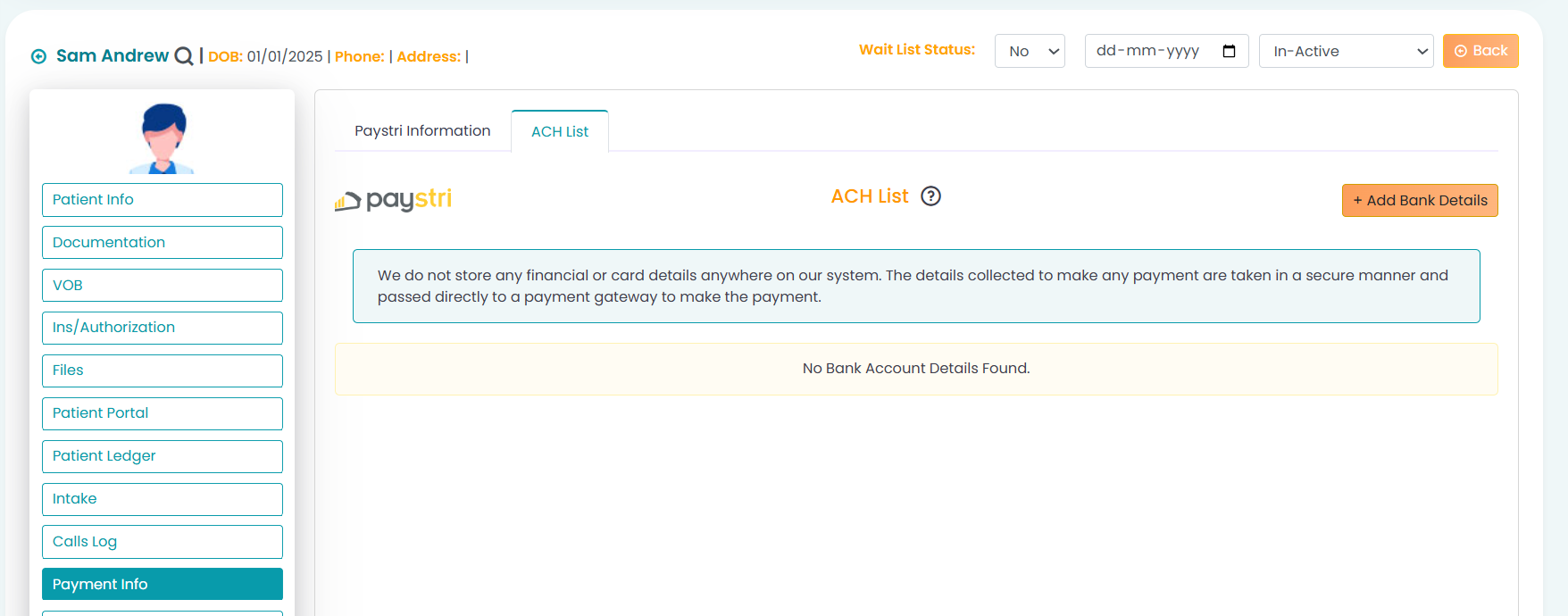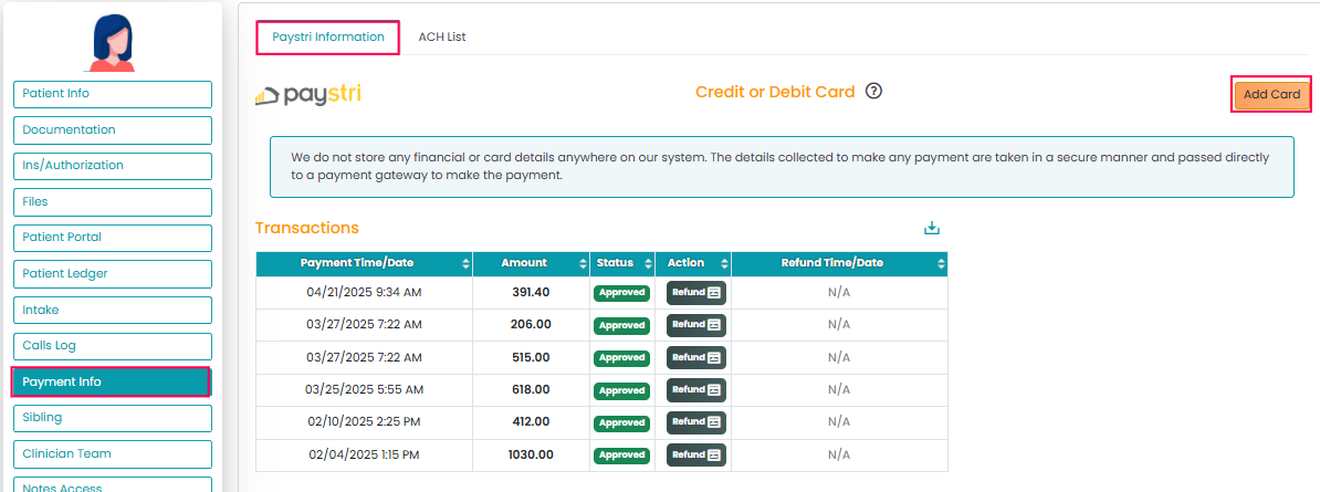 - After selecting the patient, click on the "Payment Info" option to enter all the details regarding the patient's payment information. This screen will also have any transactions made with the patient profile.