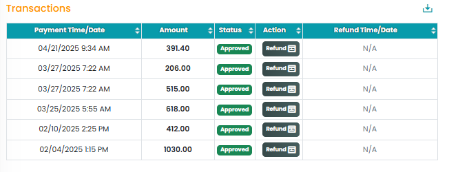 Once the admin charges the card on file or the client pays using the client portal, you can review those transactions in the Payment Info screen.