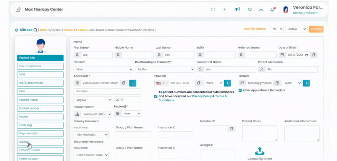 - Client assigned as sibling mail will be removed from the patient info as the patient is added as a sibling. You can use the Primary sibling email.