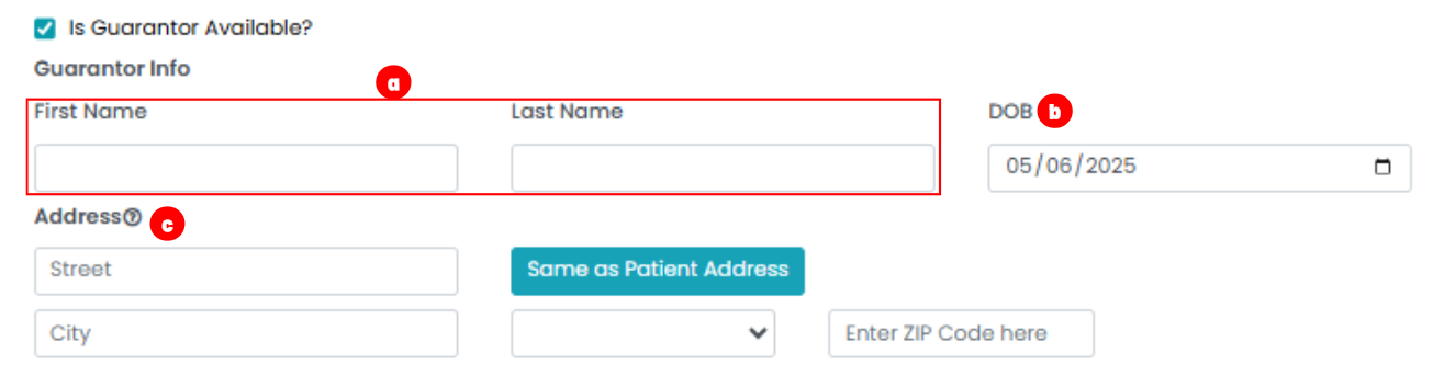 - Guarantor Address: Input the guarantor's address. If the patient and the guarantor share the same address, check the box that says, "Same as Patient Address."