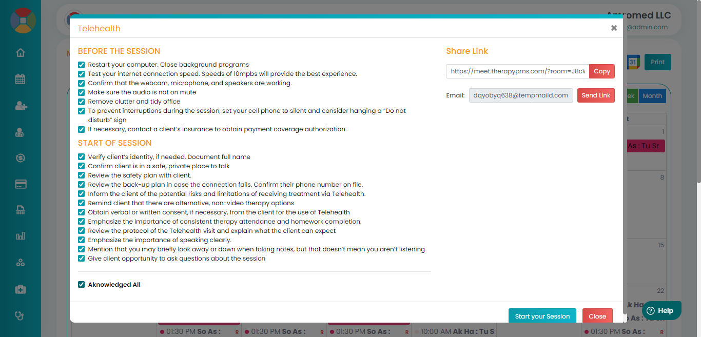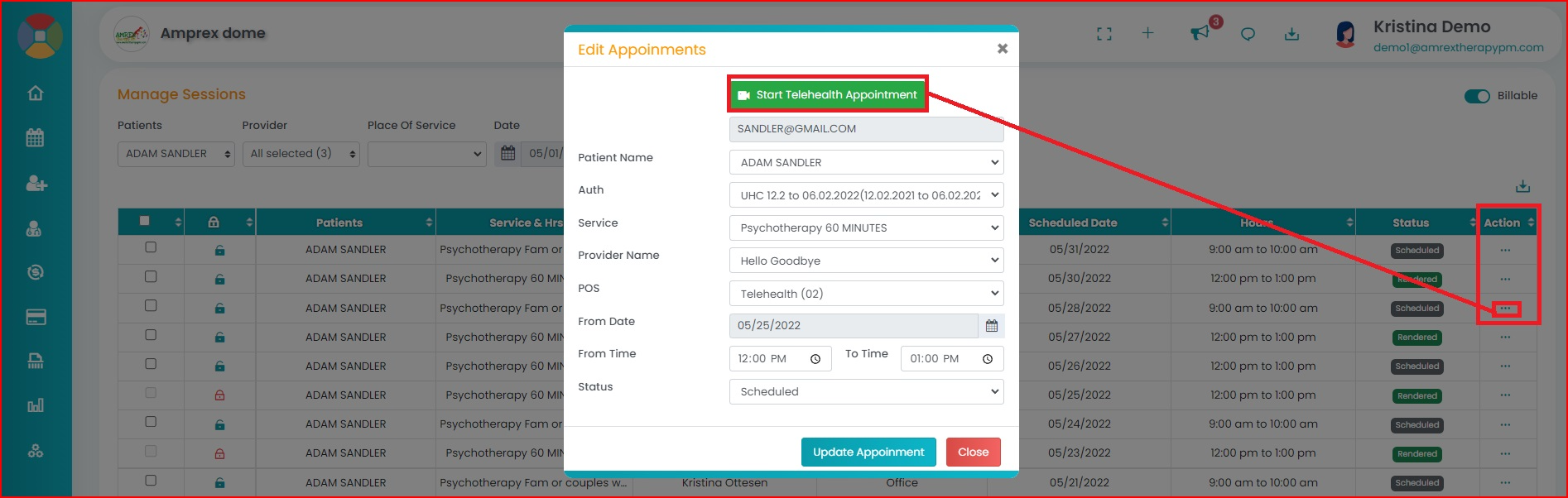 Click on the three dots(…) appearing underneath the action column and click on 'Edit Session.' Once the appointment pops up, click on 'Start Telehealth Appointment' to start the session.