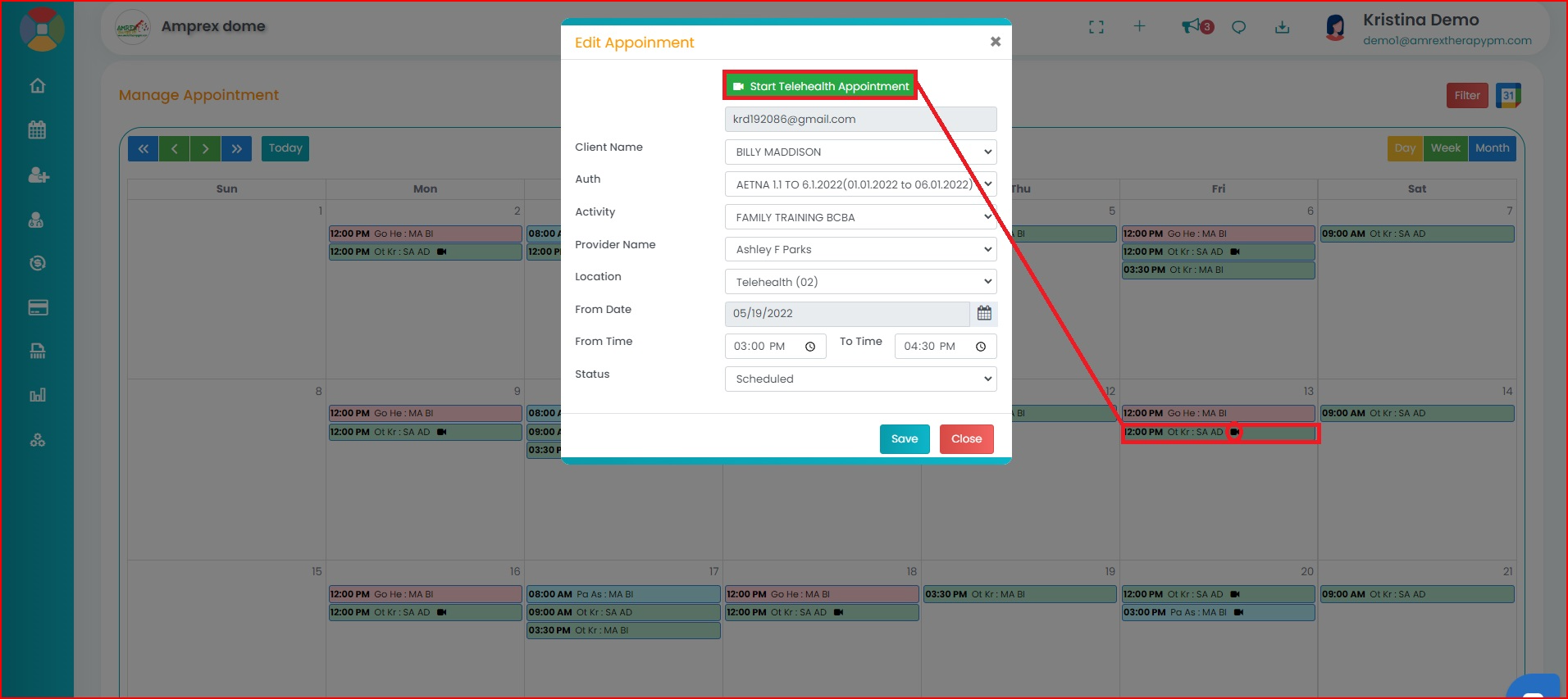 - The "Edit Appointment" popup box will appear. You can click on 'Start Telehealth Appointment' to start the session.