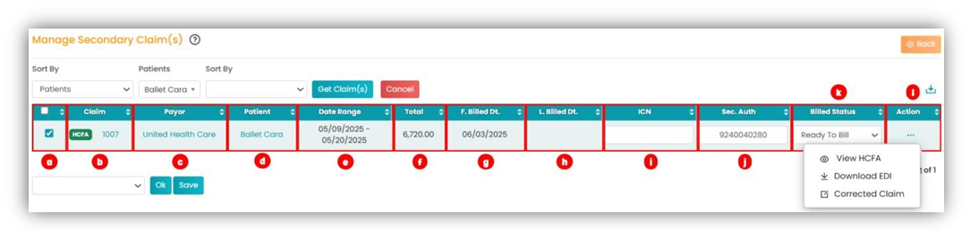 - Action button: Allows you to View HCFA, Download EDI and Corrected claim option