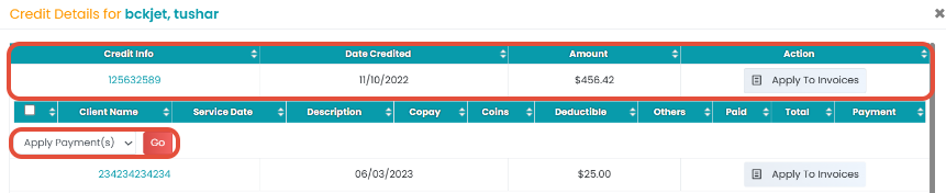 Charge Credit: As you click on this option, a new pop-up will appear. In this screen, all the deposit(s) will be displayed. Click the Apply To Invoice button to apply the credit charge to the invoice, and then click the Go button. The credit amount applied will be the maximum that can be used from the deposit. For example, if the invoice amount is $30 and the deposit amount is $18, only $18 can be applied toward the invoice. Once the payment is applied, the invoice will appear as "paid" in the Manage Statement screen.
