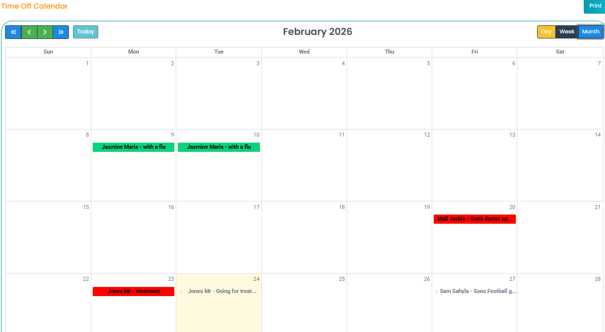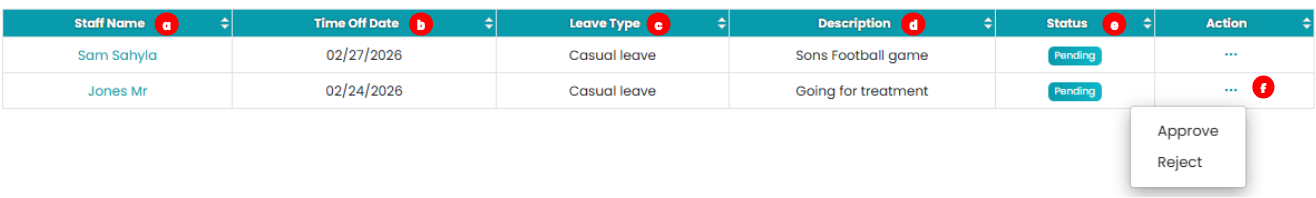 All submitted leaves will be displayed under the Time Off tab for review and management.