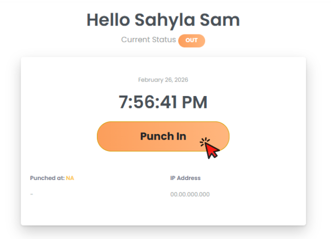 - Click on the Orange Punch In button to clock in. The system will start counting the time and also display the Current Status as IN.