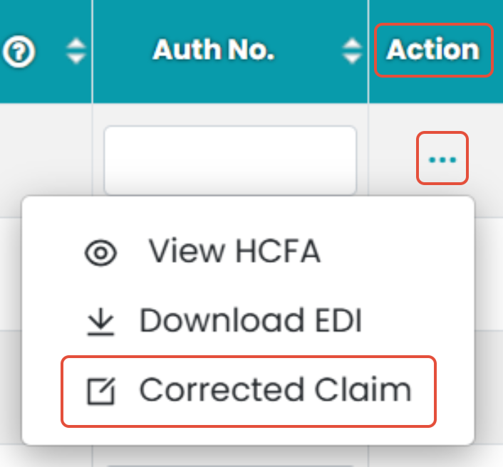 - Use the Action (...) button on the left column. Click the Corrected Claims option to make corrections to the claims. A pop-up will appear.