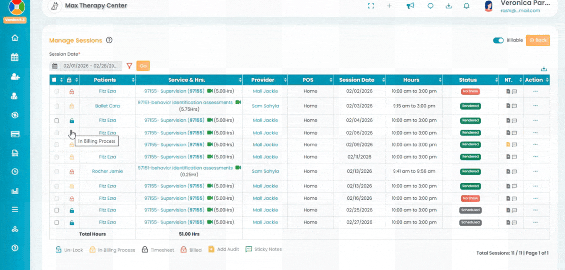 Once a session is pulled to Process Billing, it will automatically be locked within the appointment. You’ll see a yellow lock icon in the list view, and no changes can be made to the appointment at that stage.
