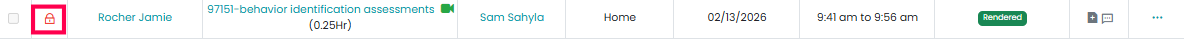 In the list view, the session appointment will display a red lock icon, indicating that the claim is in Billed status and currently under Manage Billing.