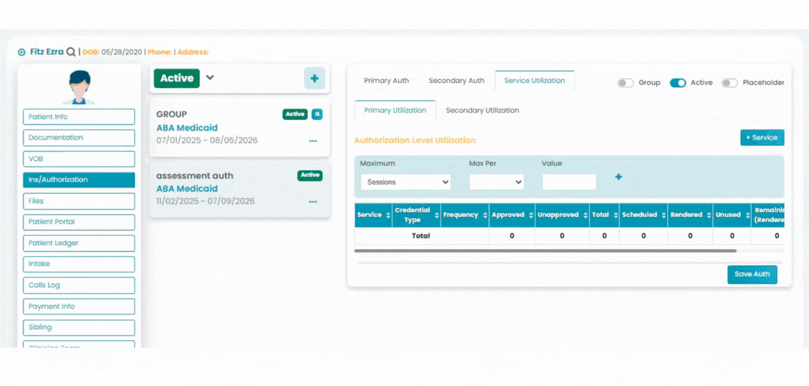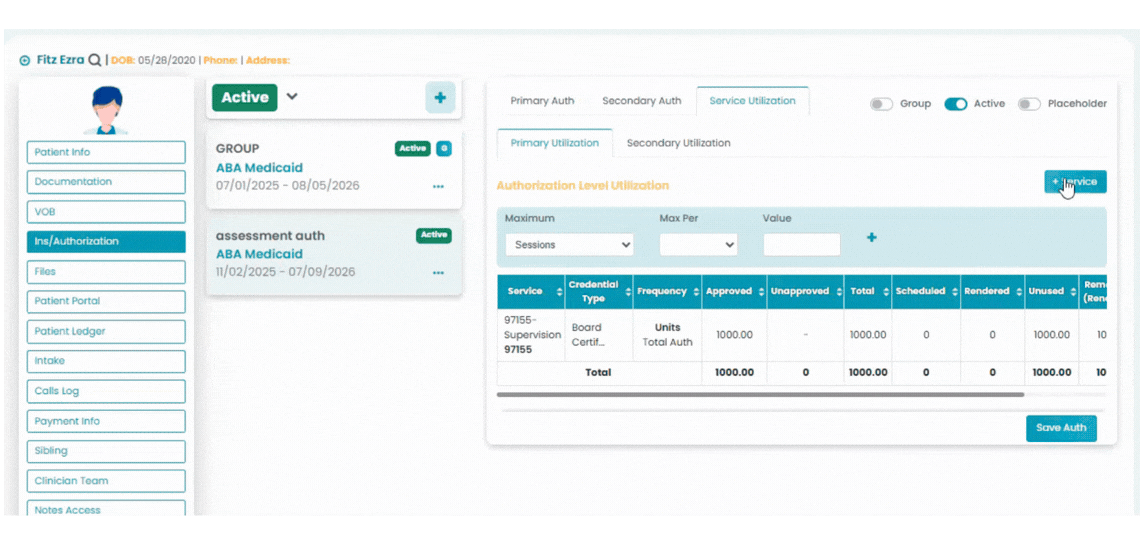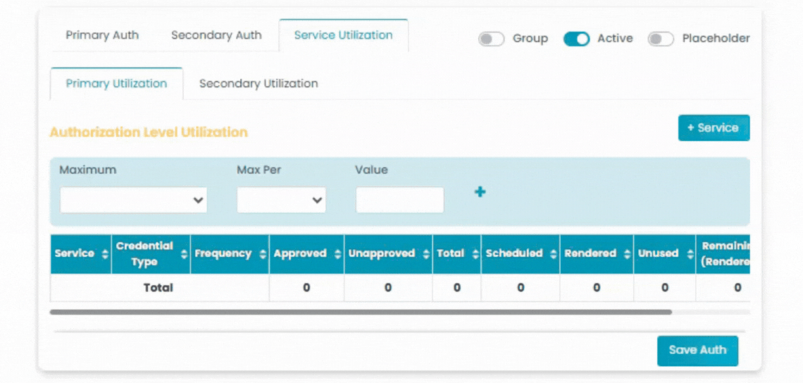 - Under the Primary Utilization tab, the Authorization Level Utilization option allows you to add the maximum number of hours, units, and sessions for the entire authorization. This can be used to track utilization at the authorization level.