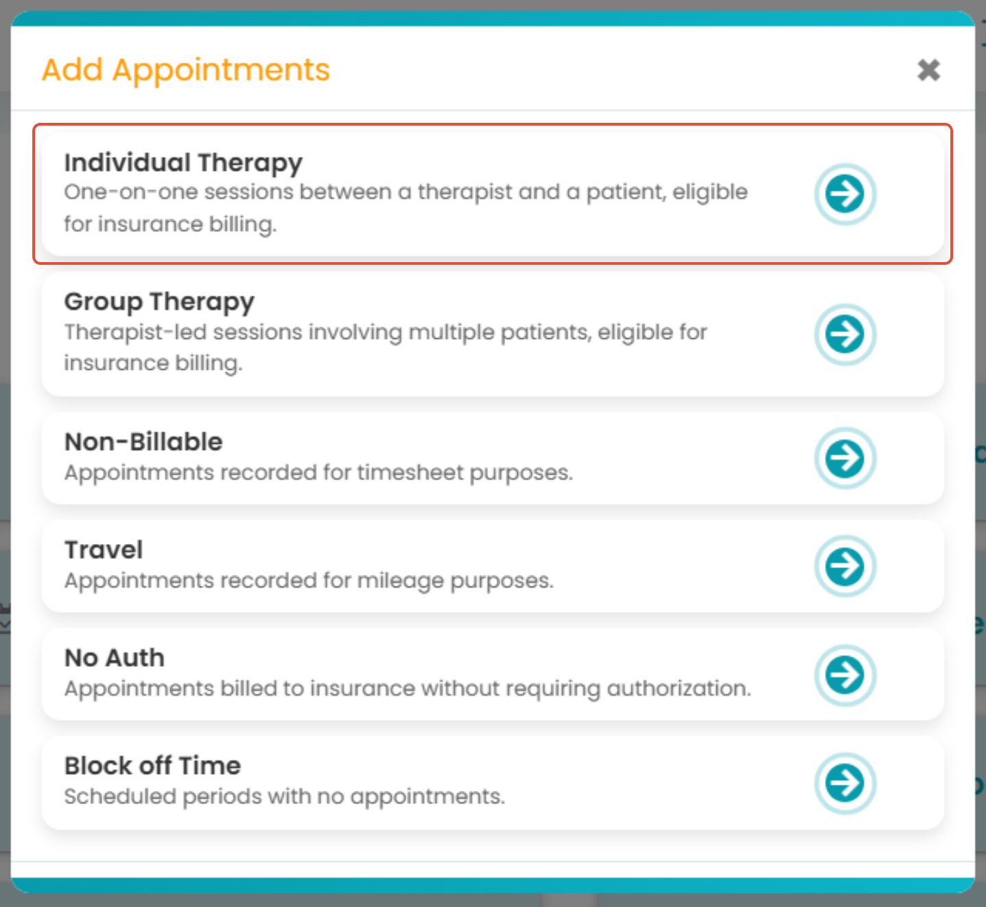 Individual Therapy is a one-on-one session between healthcare personnel and a single patient, eligible for insurance billing.