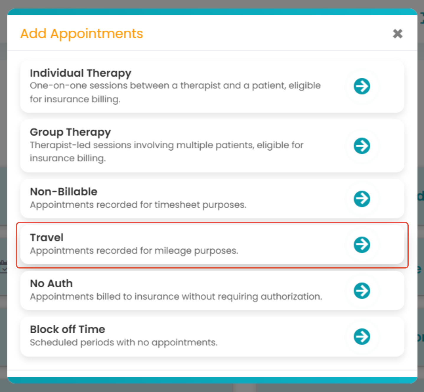 A travel appointment records accurate mileage tracking for providers' payroll. Before creating a travel appointment, ensure you enter the patient, staff, and facility address so you can track mileage accurately.