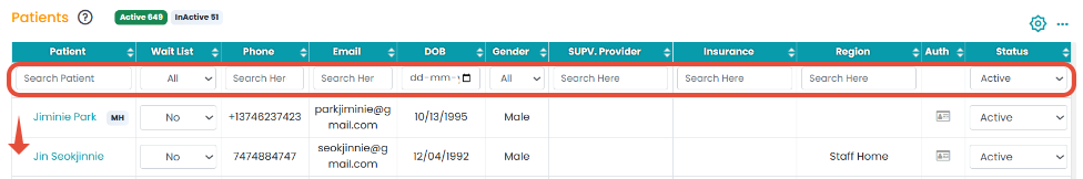 To filter the patient list, access the patient(s) module, and apply the filter criteria (name, active status, etc.).