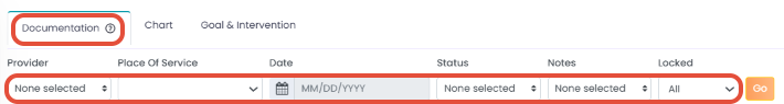 Use the filters under the Documentation (1) tab to search for session notes according to different providers, POS, date, status, notes, etc. (optional)