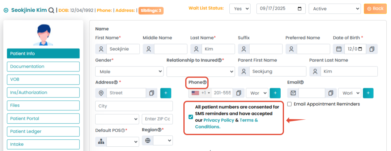 - Tick the checkbox to enable SMS reminders for the selected patient.