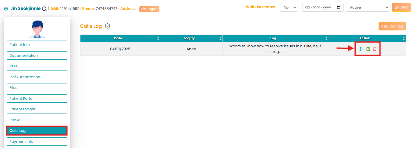 - Click the view/edit/delete icon under the Action column, respectively.To learn how to add a new call log, please visit this article!
