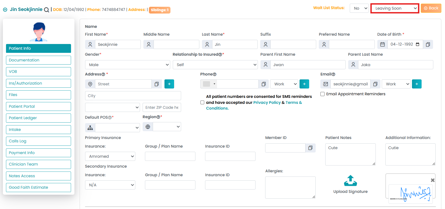 Leaving Soon denotes that the existing patient might not receive services anymore, or they may seek lesser services. All other statuses except for in-active status will be considered active statuses and appointments can be scheduled and billing can be performed.