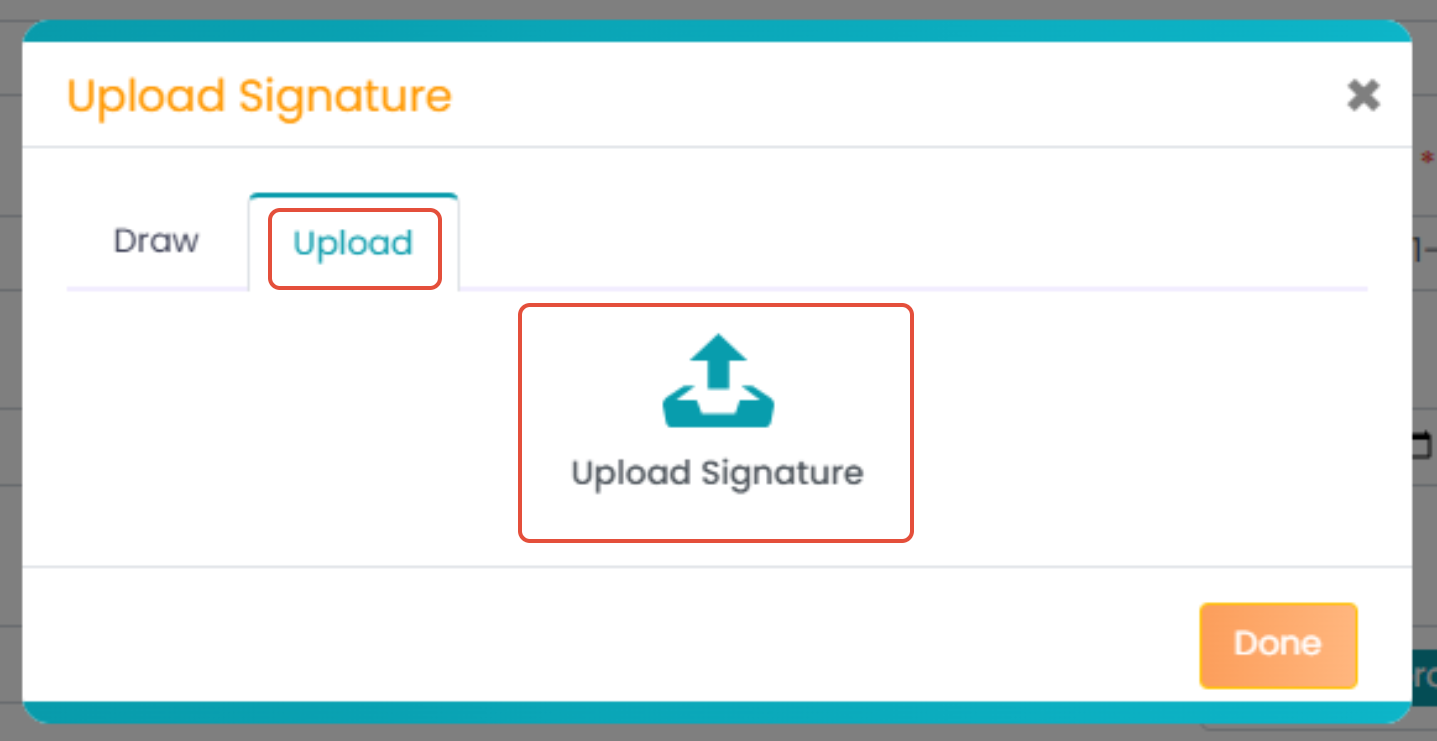 Click on the “Upload Signature” icon to upload your signature, as shown in the bottom left corner of the above image.
