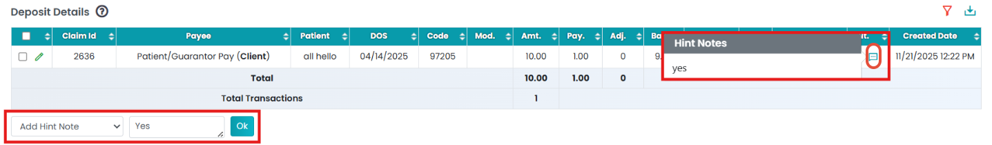 Hint Notes provide additional information related to the deposit and are useful for internal tracking.