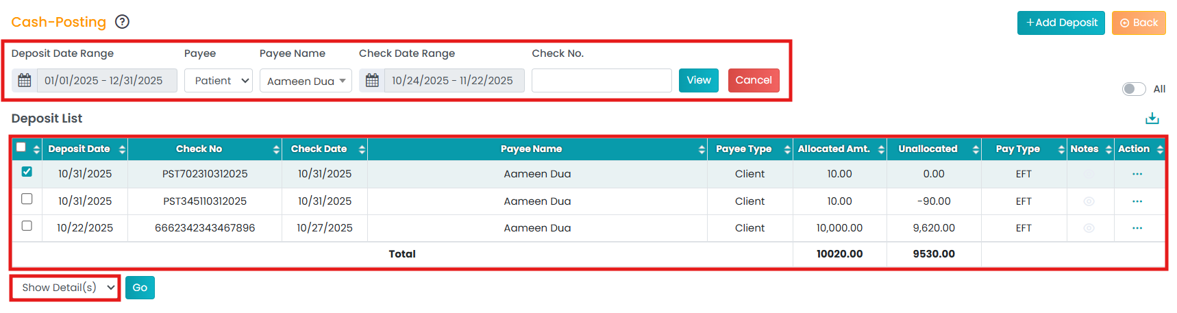 - Under the Deposit List, select a deposit and click on Show Detail(s) in the drop-down.