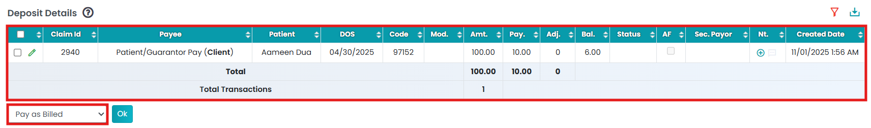 - Under the Deposit Details table, select a claim. Again, select “Pay As Billed” in the drop-down.