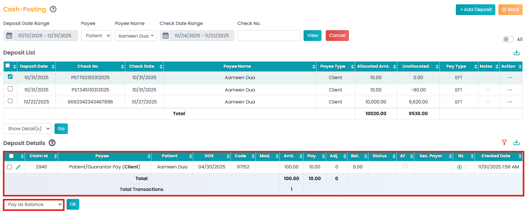 - Under the Deposit Details table, select a claim. Again, select “Pay as Balance” in the drop-down.