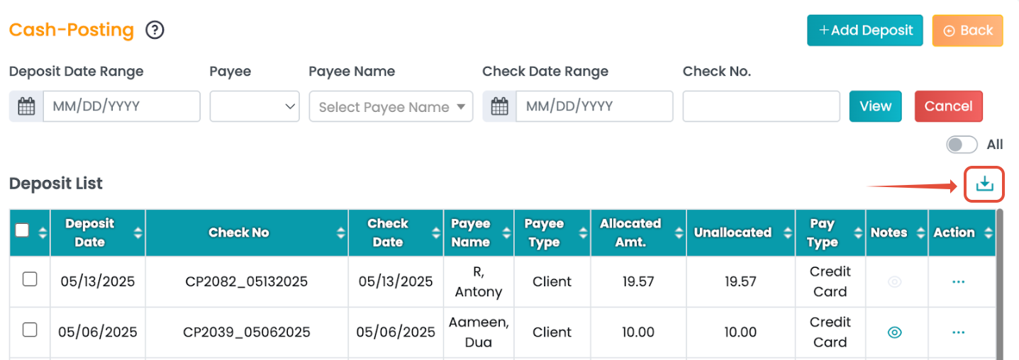 In the Cash Posting screen, look for the Export or Download button in the top right corner.