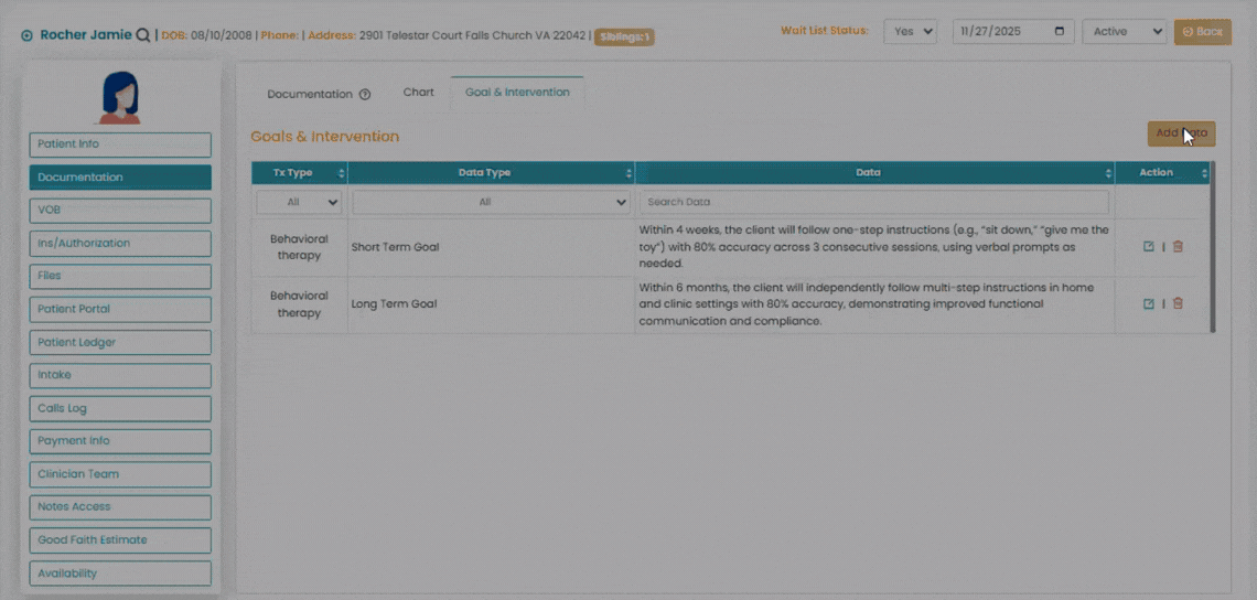This article explains how to create and manage patient goal & intervention.The Documentation option under the Patients module allows you to manage session notes linked to patient appointments. Under Documentation, the Goals & Intervention tab at the top allows you to create, view, and edit short-term, long-term goals or interventions for the selected patient.
