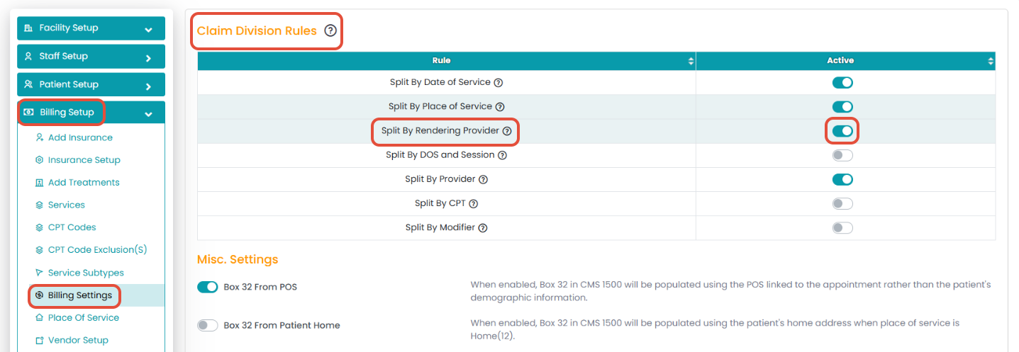 - Under Claim Division Rules, toggle ON the Split By Rendering Provider option under the Action column.