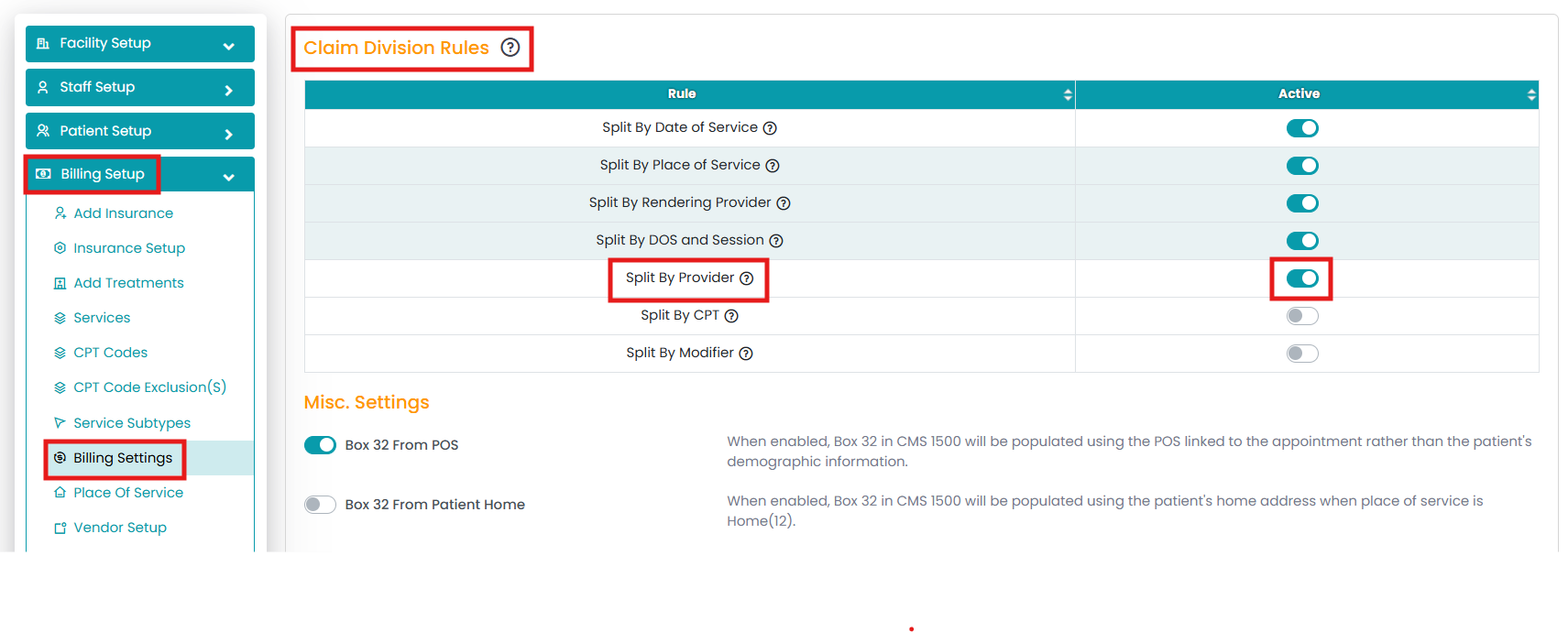 - Under Claims Division Rules, toggle ON Split by Provider under the Actions column.