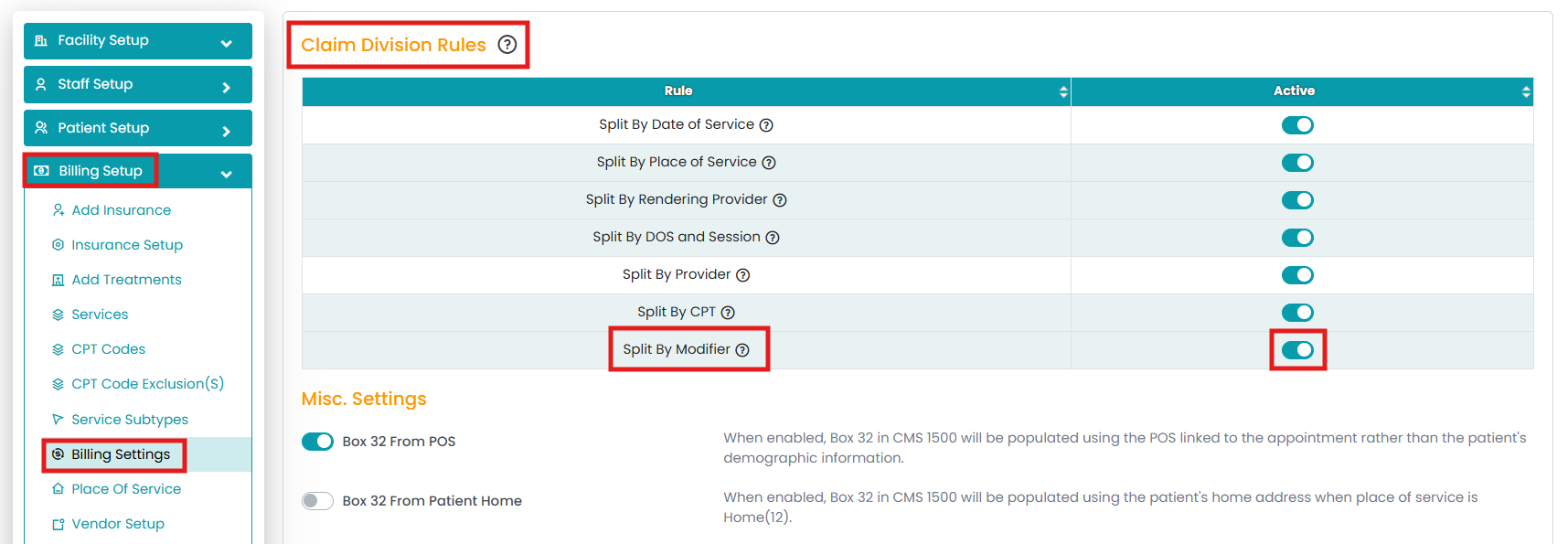 - Under Claims Division Rules, toggle ON the "Split by Modifier" under the Actions column.