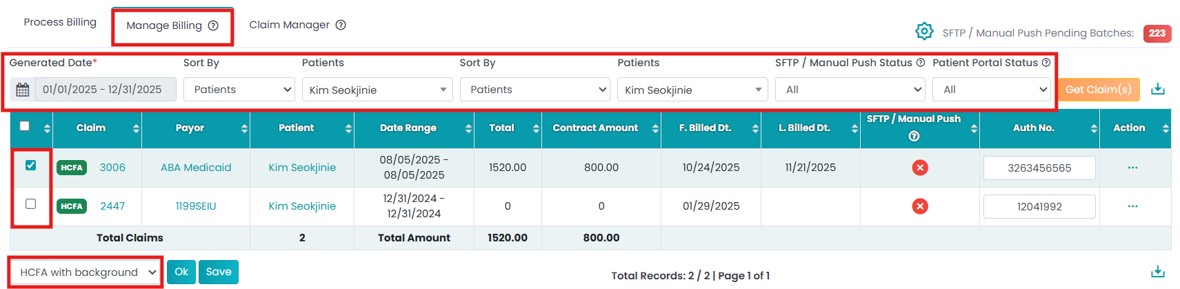 Select the claim using checkboxes. Again, select the option HCFA with Background from the drop-down.