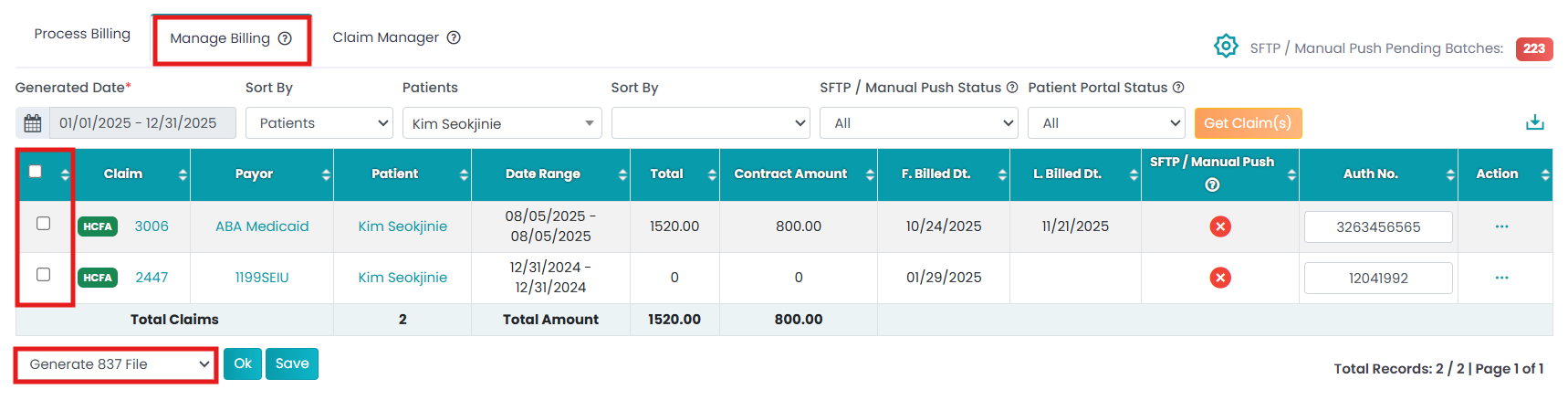 In the Manage Billing section, select the claims that need to be submitted electronically and use the Generate 837 File action to create the electronic claim file for submission.