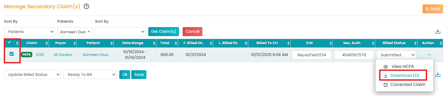 TherapyPM allows you to download an EDI file, which contains all the claim information submitted to the secondary payer.
